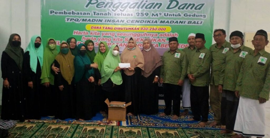 Penyerahan Bantuan Donasi untuk pembelian tanah Wakaf TPQ dari Majelis SISJANNAH Palapa Denpasar diterima oleh Pengurus Yayasan Insan Cendikia Madani Bali didampingi segenap Pengurus Yayasan. (Doc. YICMB).